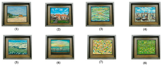 The experiment employed 12 paintings created by Ms. Sandy Lee, as shown in Figure 1. They have dimensions of 41 × 31 cm without the outer frame and 62 × 52.5 cm with the frame. Paintings 1, 2, 4, 6, 10, and 12 are landscape paintings, whereas the remaining six (3, 5, 7, 8, 9, and 11) are abstract paintings.