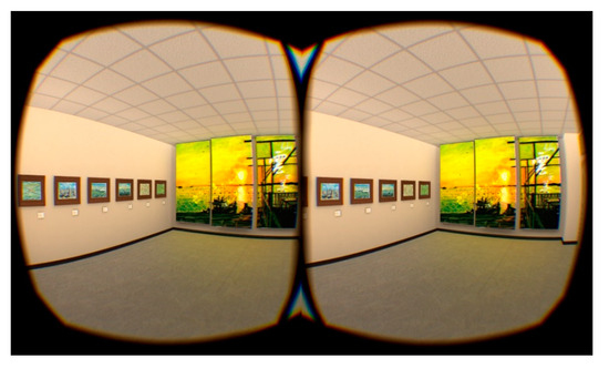 In this condition, an HTC Vive COSMOS, New Taipei City, Taiwan, device was used. The VR environment was constructed using 3ds Max software (2022 version). The electronic files of the 12 paintings were then placed within it. UNITY software (2022 version) was used to integrate the scene with the HMD. The viewing method of this experimental condition was similar to that of the physical environment. The pictures viewed with the HMD moved in accordance with the physical movements of the participants, as shown in Figure 5.