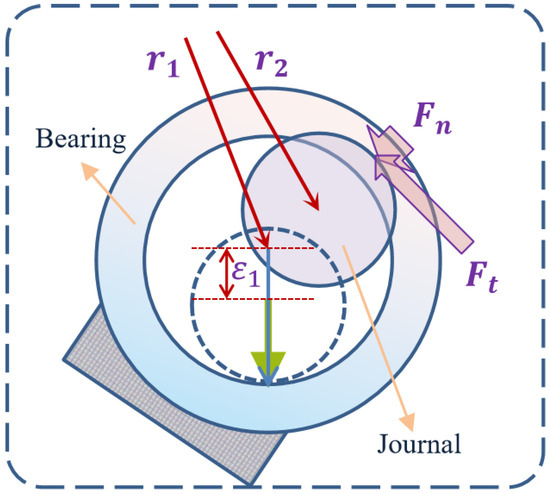 The penetration of the two contacts can represent the contact state of the bearing and journal. When , the bearing and journal do not come into contact. The normal contact force between the bearing and journal can be obtained as follows [20]