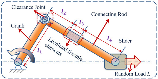 Mechanism systems are the core functional modules in mechanical products, which are mainly used for the transmission of motion and force. Through the design of mechanism structure, the specified input motion form can be transformed into reciprocating motion, rotary motion, intermittent motion and other target motion forms to complete the displacement and speed conversion. Mechanisms are also capable of changing the magnitude and direction of force to enable mechanical products to perform complex operations, such as lifting heavy objects, amplifying and reducing force, etc. Mechanism systems are widely used in aerospace machinery systems, automobiles, industrial robots and other important mechanical equipment [1,2,3]. With the increase in product requirements for high speed, high precision and heavy loads, the requirements for mechanisms in terms of accuracy, stability, durability and safety are constantly increasing. If failures occur, such as excessive clearance wear and component stiffness degradation, the mechanisms may fail with serious consequences. For example, the fault in a satellite connection mechanism or a failure of the synchronization mechanism may affect the normal separation or deployment of the satellite and prevent the satellite from working properly [4]. The normal operation of the aircraft landing gear mechanism has a very important impact on the safe operation of the aircraft and passenger safety. Therefore, it is very necessary to carry out the reliability analysis of the mechanism, identify the key mechanism failure, analyze the impact of failure, and improve the service life and reliability of mechanisms.