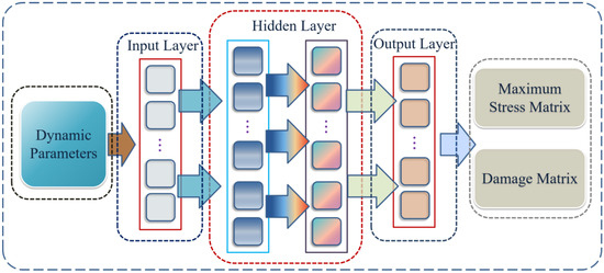 It should be noted that the elements in the same position of the maximum stress matrix and the damage matrix originate from the same history and attention should be paid to the correlation between the two elements when fitting the neural network to avoid errors due to independent assumptions and fitting with different input parameters. Neural network models can capture complex nonlinear relationships between input data and output data through multi-layer structures and activation functions. Neural networks can effectively handle high-dimensional data, utilize their powerful representation to extract effective features, which can maintain good prediction performance on new data to avoid overfitting. Therefore, neural network models have very obvious advantages in data fitting. In order to complete the stochastic stress characterization based on the above stress analysis results using the neural network technique for data fitting, the fitted input parameter matrix within the ith TP is listed as follows: