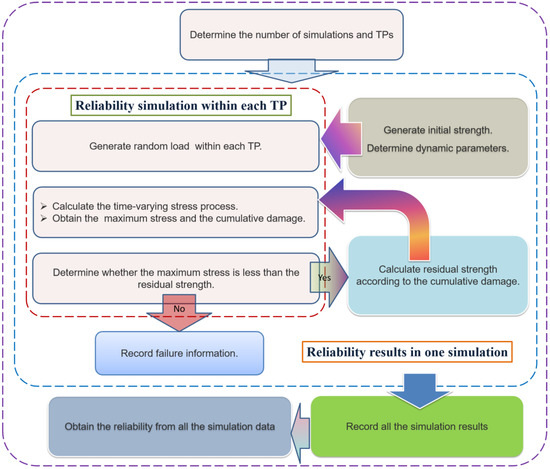 In order to verify the correctness and validity of the proposed reliability models, the Monte Carlo simulation method is used in this paper. In the Monte Carlo method, the working process is simulated based on the working mechanism of the mechanisms and the stochastic characteristics of the system parameters. The proposed reliability models are not used in the simulation process. In this way, it is possible to make the simulation process independent of the proposed computational models, thus accomplishing the validation of the reliability analytical models. The specific Monte Carlo simulation process is shown in Figure 5. As shown in Figure 5, during each simulation of the system, in each TP, random loads are generated according to the random distribution characteristics of the loads and the corresponding stress responses are obtained. Through the damage caused by the stress and the maximum stress, it is judged whether the residual strength can resist the working stress. When the system can work normally in all TPs, the system is considered to be reliable, otherwise the system is considered to fail. Finally, the system reliability is obtained by counting the number of system failures.