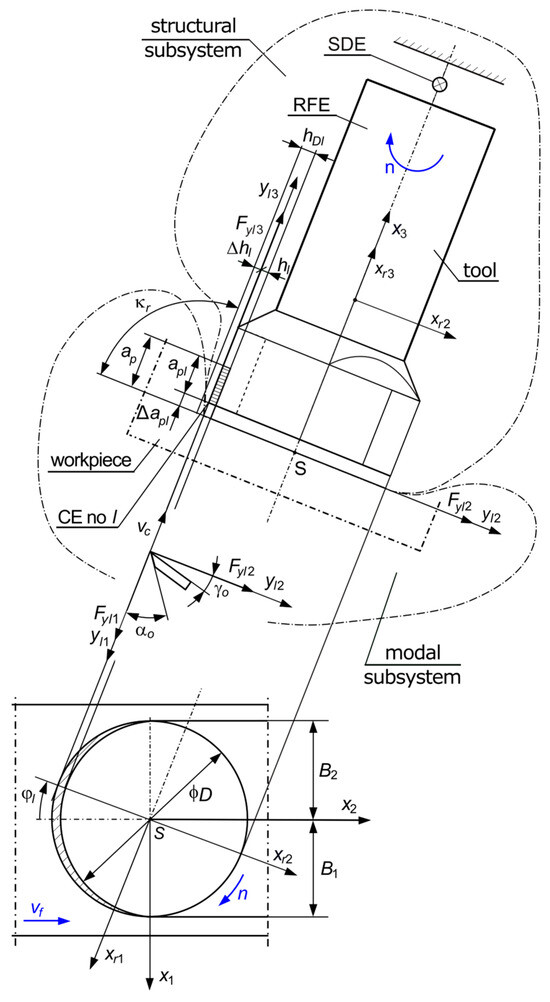 For the temporary point of tool edge—workpiece contact—modeled as CE no. l, a proportional model of the dynamics of the cutting process was adopted [30,31]: