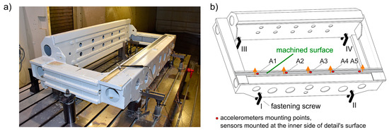 In this context, an interesting group of possible solutions for vibration reduction are methods dealing with workpiece clamping to the machine table. Some of them concentrate on the design of clamping elements such as, for example, a system of bilateral supports for machining large aircraft engine components [15] or a modular system for flexible clamping of large workpieces [16]. Others, however, try to minimize geometric errors or milling vibrations by optimizing the layout of passive fixtures using, for example, a table with clamping elements acting from the sides on the workpiece and a matrix of supports from the bottom with the actual selection of active (attached to the workpiece) supports optimized using the Genetic Algorithm [17], selection of the supports’ positions for a geometrically complex object (engine block) for surface quality improvement [18], selection of the supports’ positions to increase the static fixture stiffness using various Machine Learning algorithms [19], and optimization of the supports’ positions to minimize deformations of large ship elements using a modified direct stiffness method and improved Particle Swarm Optimization [20]. An interesting set of examples of active and passive methods and devices, mostly for milling thin-walled elements for the aeronautic industry, is included in [21]. Also, in [22], a review of various approaches for fastening thin-walled objects, including large-size ones, is presented. Unfortunately, many of the methods discussed in the literature are supported only by simulations and are not verified by experimental research, especially if they concern large workpieces.