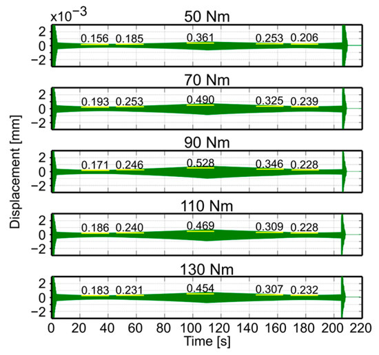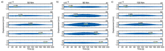 Workpiece displacements during full milling for screw setting: (a) 50 Nm, (b) 90 Nm, and (c) 130 Nm.