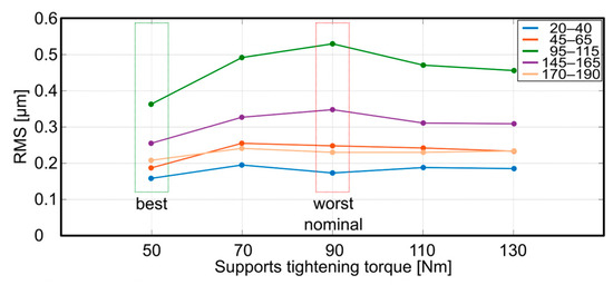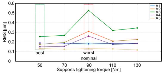 The experimental results show that clamping the workpiece with the screw’s tightening torque set to 50 Nm provides the best results from the point of view of vibration level reduction. At the same time, for the case when screws were tightened with a torque of 90 Nm, the vibration level was the highest. This means that the proposed method is able to accurately predict both the best and the worst clamping conditions. This is especially true for the middle part of the workpiece. For the external zones of the workpiece, the results are only apparently inconsistent. For zones around sensors A1 and A5, vibration levels are very similar for each screw setting. For A1, the relative difference between the mean value and the RMS results for each screw setting is less than 2%, and for A5, it is less than 6%. For comparison, in the middle of the workpiece, for sensor A3, it is 35%. This means that for external workpiece zones vibration levels are eventually almost the same for any clamping screw settings. This confirms that in the case of the considered workpiece, it is important to focus on reducing vibrations in its middle part. Reduction in the vibrations in external zones is less important.