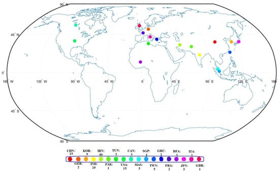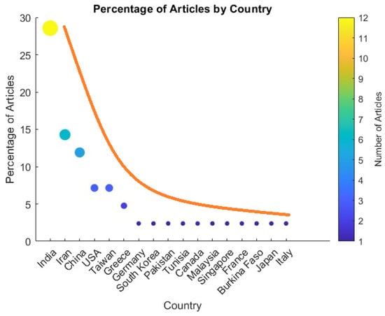 Graphical representation of the trend in the number of scientific articles published between 2001 and 2022 on using ANN in groundwater studies. The size of the dots indicates the number of articles related to each country. The larger the number of articles, the bigger the dot.