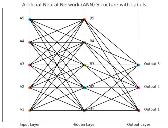 ANNs are some of the most powerful machine learning algorithms based on the structure and function of the human brain’s neural system. These networks consist of neurons and their connections [11]. Each neuron in this network acts as a processing unit, with the weights corresponding to its connections determining the importance and impact of the inputs on the outputs [10]. The structure of an ANN typically includes three layers [12]: (1) the input layer is responsible for receiving the input variables; (2) the hidden layers, situated between the input and output layers, are responsible for the main information processing; and (3) finally, the output layer produces the result. The working method of ANNs in the training process involves providing inputs to the network, which produces corresponding outputs. The generated error is then compared with the desired output, and the network’s weights are automatically adjusted to minimise the error. This process is repeated until the weights reach an optimal value, allowing the network to predict more accurately [13].