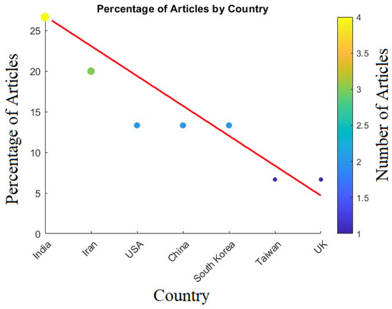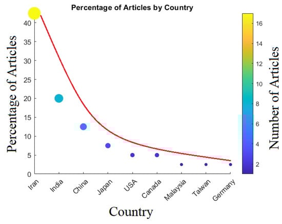 In groundwater studies, ANNs are powerful tools with many applications [15]. These include GWL prediction, identifying geologic patterns associated with groundwater, and improving the performance of existing groundwater potential mapping. ANNs can improve cartographic models, increasing their predictive accuracy [16]. An analysis of 41 articles from 2001 to 2022 shows that ANNs are widely used worldwide, with India and Iran standing out as essential players (Figure 4).