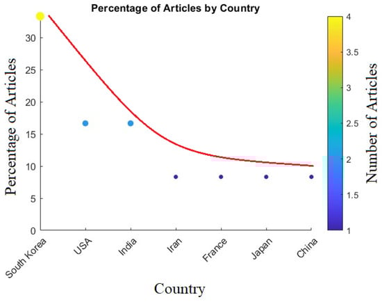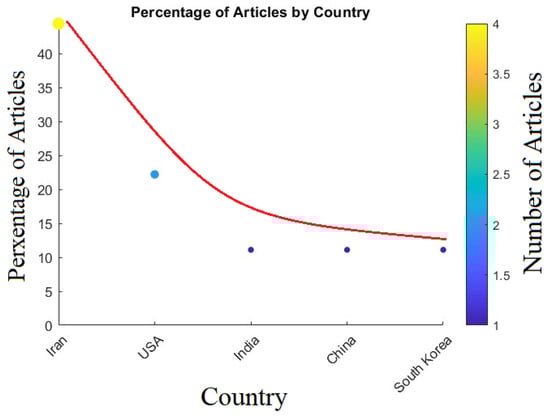 Graphical representation of the trend in the number of scientific articles published between 2011 and 2023 on using SVM in groundwater studies. The size of the dots indicates the number of articles related to each country. The larger the number of articles, the bigger the dot.