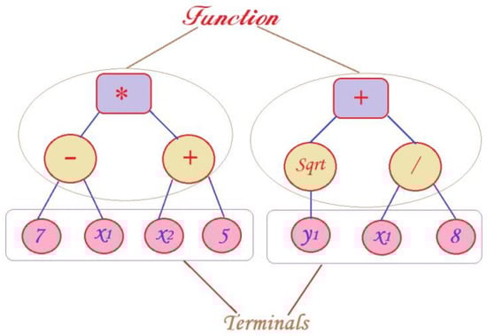 Figure 11 shows an example of a GP model consisting of two tree-branch structures [2]. The left tree structure is (7 − X1) × (X2 + 5), where X1 and X2 symbolise random variables. The right tree structure can be constructed as sqrt(Y1) + (X1/8), where Y1 denotes another random variable. The GP’s tree-based configuration essentially entails nodes embodying functions and terminals, structured hierarchically to formulate mathematical expressions or programmes to address specific problem-solving objectives.