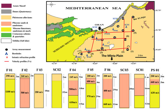 A geological map of Oran and the enclosing region, modified from [6,29]. Black filled circles are array locations. The nine available boreholes from F01 to F06 and SC01 to SC03 (blue triangles) and the seismic refraction profile PS01 show the thickness of the sediment layers and their velocity (Vs). The red lines are cross-sections.