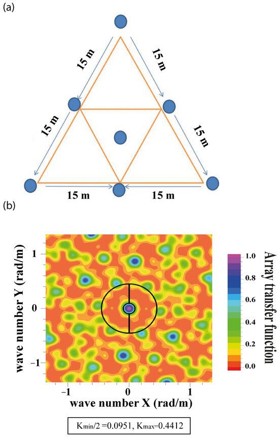 (a) Array geometry. Blue dots are seismic stations. (b) Theoretical response. The large and small black circles correspond to Kmax and Kmin/2 values, respectively.