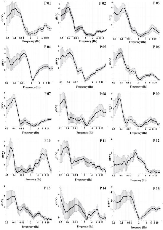 The average HVSR curves obtained for each of the arrays analyzed (P1 to P15), whose position is indicated in Figure 2. For each curve, the thick black line corresponds to the averaged HVSR curve; meanwhile, the vertical gray bars reflect the standard deviation values at each frequency.