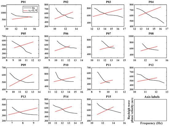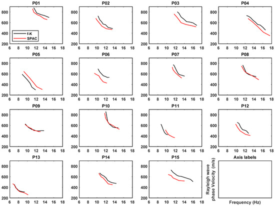 The dispersion curves estimated for each recording site using the f-k analysis (black line) and the SPAC method (red line). The dispersion curves are plotted in terms of the Rayleigh wave phase velocities (m/s) as a function of frequency (Hz). Each plot corresponds to the results obtained at the different analyzed sites (P1 to P15). In Figure 2, the position of these sites is shown.
