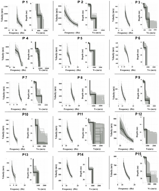 Rayleigh wave dispersion curves (left panels) and Vs models (right panels) estimated for all the analyzed sites from P1 to P15. In the left panels, the experimental dispersion curve is represented by the mean value (black thick line) and the corresponding standard deviation (vertical black bars). On the other hand, the theoretical dispersion curves associated with the different estimated Vs models are represented by dark gray curves (related with the models with a minimum misfit plus 10%) and light gray curves (related with all the tested models). In the right panels, the Vs model with the minimum misfit (black thick line), the Vs models with the minimum misfit plus 10% (dark gray lines), and all the tested models (light gray lines) are shown.