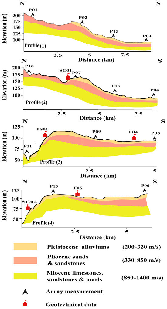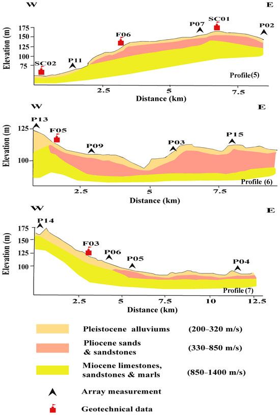 The Vs velocity profiles shown in Figure 6 have been obtained by inverting the dispersion curves obtained with the f-k analysis. The inversion of the dispersion curves is a delicate process. For example, at some sites, the procedure has to be repeated several times until reaching an acceptable misfit with a reliable and logical shear-wave velocity model. The obtained Vs models are in agreement with the ones obtained in previous works on the Lower- and Middle-Chelif Basins [23,24,25,27].