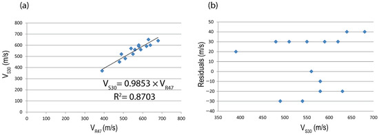 (a) Regression line (Vs30 vs. VR47) and the derived equation. R2 is the correlation coefficient. (b) The respective residual values.