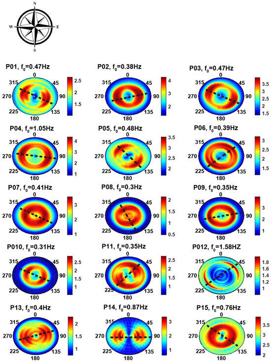 HVSR polar diagrams. The color bar indicates the HVSR amplitude variations, and the dashed line represents the estimated directionality.