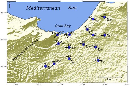 In general, ambient noise is mainly caused by marine waves and man-made activity, such as cars and factory machines. This is probably what could influence the change in directionality in our study area. Anyway, the results show that in most of the analyzed sites, the directionality is approximately perpendicular to the coastline (see Figure 11), which may be related to the sea waves that hit the cliffs bordering the city of Oran from the north.