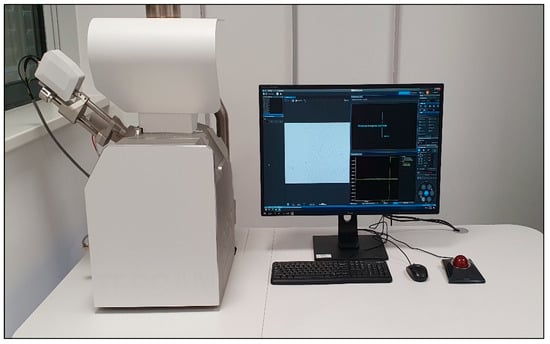 The equipment used to perform SEM analyses to provide information on film morphology (shape, size, and size distribution of crystallites) was a TESCAN VEGA, Kohoutovice, Czech Republic, having the following characteristics: energy—200 eV–30 keV, beam current—1 pA to 2 µA, resolution—3 nm at 30 keV, magnification 1×–1,000,000×, Figure 2.