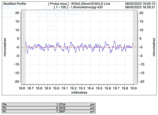 The investigated roughness parameters were evaluated for each individual sample. To collect the profile, the sample was fixed to the table of the equipment and assessed using a probe with a 2 µm tip and a scanning speed of 0.25 mm/s.