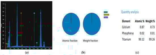 (a) EDS spectrum of Ti, samples 1-10, sprayed with white electrocorundum F90 of particle size 0.15–0.20 mm mixed with sintered hydroxyapatite 3:1, normal working pressure, 6 bar. (b) Atomic fractions and weight fraction of Ti, samples 1-10, sprayed with white electrocorundum F90 of particle size 0.15–0.20 mm mixed with sintered hydroxyapatite 3:1, normal working pressure, 6 bar. (c) Quantitative analysis of Ti surface, samples 1-10, sprayed with white electrocorundum F90 of particle size 0.15–0.20 mm mixed with sintered hydroxyapatite 3:1, normal working pressure, 6 bar.