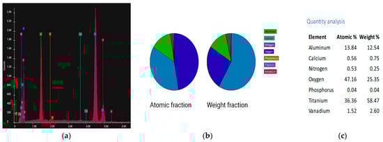 (a) EDS spectrum along the line of Ti6Al4V alloy, samples 1-10, sprayed with white electrocorundum F90 of particle size 0.15–0.20 mm mixed with sintered hydroxyapatite 3:1, normal working pressure, 6 bar. (b) Atomic fractions and weight fraction of Ti6Al4V alloy, samples 1-10, sprayed with white electrocorundum F90 of particle size 0.15–0.20 mm mixed with sintered hydroxyapatite 3:1, normal working pressure, 6 bar. (c) Quantitative analysis of Ti6Al4V alloy surface along the profile line, samples 1-10, sprayed with white electrocorundum F90 of particle size 0.15–0.20 mm mixed with sintered hydroxyapatite 3:1, normal working pressure, 6 bar.