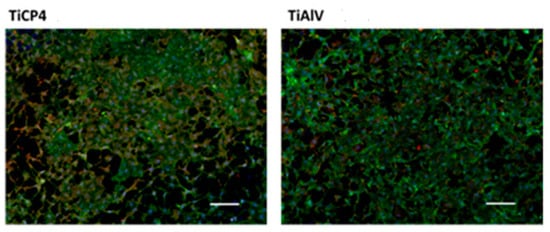 Regarding cell culture and proliferation, as can be seen in Figure 11, Figure 12 and Figure 13, the sandblasted Ti and Ti alloy allowed the adhesion of cells 48 h after seeding, the cells being found on the entire available surface of the materials.