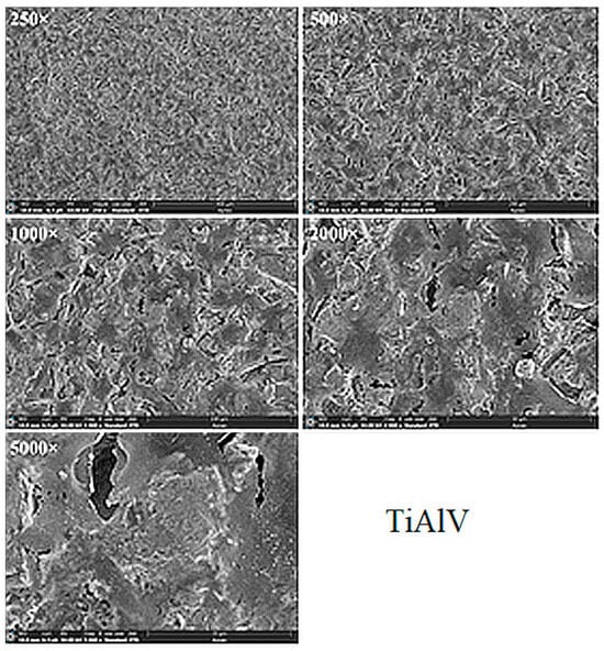 Electron microscopy certified the uniform distribution of chemical compounds in the crystalline-looking groundmass. The elemental composition consists of Ti, Al, and V, elements obviously expected as they form the Ti or Ti alloy samples. The other elements are found in variable percentages depending on blasting/spraying materials, as the case may be, confirming that in the case of sandblasting, there is an inevitable result that traces of the sprayed material are found attached to the blasted materials, implying that an additional cleaning procedure ought to be employed, as the case may be, or the imposed requirements. Their concentration is, however, very small.
