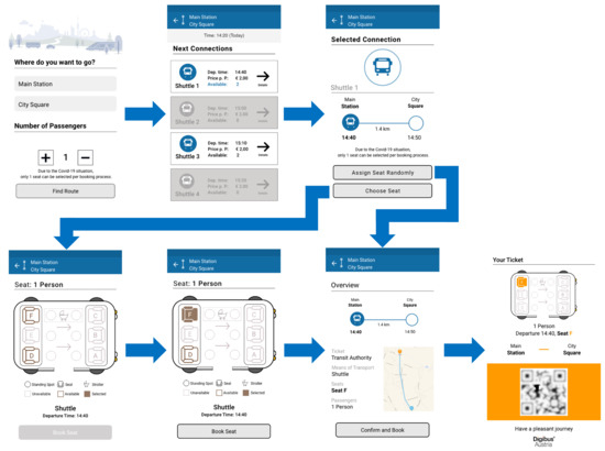 The mobile booking application was designed to be intuitive and user-friendly, allowing passengers to book rides, manage payments, and receive notifications about shuttle availability and boarding instructions.The interface was implemented as a mobile-based click-dummy, with the logic shown in Figure 1 in mind. For the visualisation and interaction design, we followed an approach suggested by Wallner et al. [19] and Mirnig et al. [11,20]. Figure 2 provides screen shots of the interactive prototype. The click-dumm, had no backend integration but provided an interaction experience similar to a fully integrated booking system. It was implemented in Adobe XD (https://www.adobe.com/at/products/xd.html (accessed on 16 September 2022)).