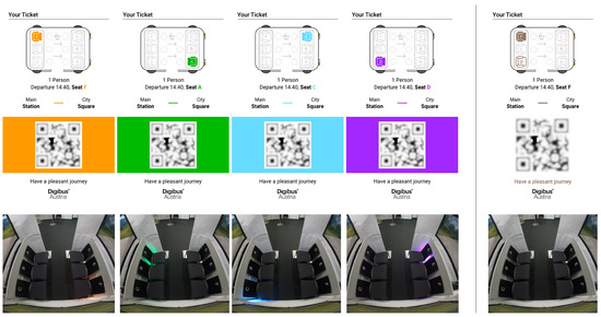 The screen design was based on an existing booking application called Wegfinder (https://wegfinder.at/ (accessed on 16 September 2022)). Designs and assets were provided by the app developers and used with permission. Since the Wegfinder app did not include support for booking specific seats, this functionality was added (see Figure 2), including the possibility to randomly assign a seat. After confirmation of the booking, a ticket with a QR code and relevant information for the boarding process (i.e., number of passengers, departure time, seat label, and route) was displayed. Here, we want to mention that the colour-coding of the final ticket was later on used for the boarding procedure. Each of the different seats had their own colour representation. The QR code on the ticket was used to board the bus and to activate the boarding interface (i.e., ambient light) inside the bus.
