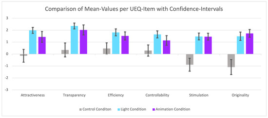 Comparison of conditions with adjectives given by standard UEQ. Values between −0.8 and 0.8 represent a neutral evaluation. If the values are >0.8, they are positive but if they are <−0.8, they are negative. The range of the rating scales is between −3 (horribly bad) and +3 (extremely good). However, only values in a limited range are considered (−2 < 0 < 2), which means that a value of, e.g., 1.5 is quite a good value.