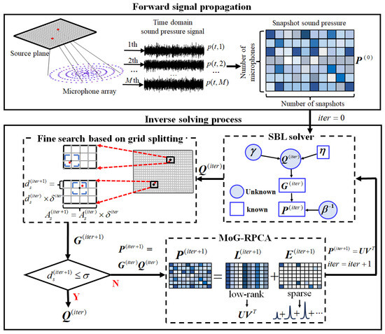 | Input: The snapshot sound pressure: . 1: Discretize the source plane into a grid surface with as the aperture and as the spacing. 2: Establish the transfer matrix between the sound pressure and the source surface. 3: The initial value of the iteration number “” is set to 0. The decay factor and the iteration stopping threshold are set. 4: while . 5: The initial source strength is obtained by sparse Bayesian learning. 6: Split the meshes to update near the local maximum of , with and . 7: Remove duplicate grid points and construct a new transfer model . 8: Form a new sound pressure , and enter it into the MoG-RPCA model. 9: Replace the new sound pressure with the separated low-rank matrix: . 10: . 11: end while Output: The estimation of source strength . |