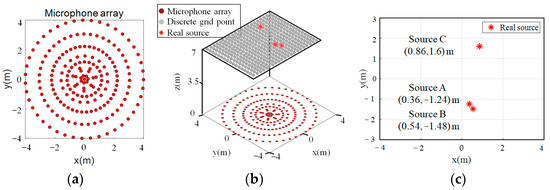 In this section, the source localization process is simulated through a series of simulation experiments. To achieve high-precision identification of far-field low-frequency sound sources, in terms of the layout of the microphone array, an array evaluation function is constructed with spatial resolution and dynamic range as the goals, and an adaptive optimization design method for microphone arrays is designed. This method derives the response analytical expression and resolution constraint function of the annular microphone array, constructs the performance evaluation function of the microphone array composed of multi-circle annular arrays, and establishes an array optimization algorithm based on the annular array, which can achieve high-resolution and high-dynamic-range measurement of wideband noise sources. The microphone array used in the simulation is optimized in this way. It is a circular array consisting of 193 array elements [53], and the distribution of array element positions is shown in Figure 3a. The array aperture is 8 m, and the distance from the array to the sound source plane is 7 m. The sound source plane is set to be a rectangular plane of 8 × 6 m, uniformly discretized into 81 × 61 grid points (the spacing of adjacent discretized points in both directions is 0.1 m). The schematic diagram of the microphone array and sound source arrangement for the simulation experiment is shown in Figure 3b. Three monopole sources are set up, as shown in Figure 3c, with Source A, Source B, and Source C located at (0.36, −1.24) m, (0.54, −1.48) m, and (0.86, 1.6) m, respectively, and the amplitudes and phases of the sources are randomly assigned to ensure the generality of the methods. Complex Gaussian noise with a certain SNR is added linearly to the target signal to simulate the actual test environment.