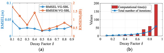 In the simulation, the frequency of 500 Hz is taken as an example, and the SNR is taken as 10 to 40 dB, with an interval of 10 dB. The decay factor is adjusted from 0.1 to 0.9, with an interval of 0.1, and the higher the value, the slower the decay speed is. The results of RMSEL and RMSEM are calculated for different values of , as shown in Figure 4a, representing the average of all SNRs. Figure 4b shows the corresponding calculation time and total number of iterations under different values of .