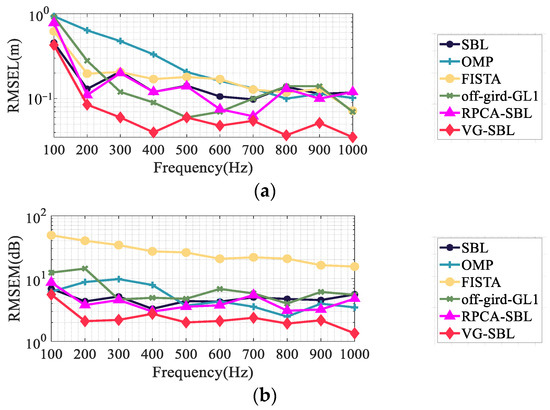 In this section, the effects of source frequency, SNR, and microphone array on the performance of the sound source identification results are analyzed using the same simulation conditions as in Section 4.2.1 and compared with the conventional methods SBL, OMP, FISTA, off-gird-GL1, and RPCA-SBL. The source frequency ranges from 100 to 1000 Hz with an interval of 100 Hz, and the SNR ranges from 10 to 40 dB with an interval of 5 dB. For the OMP method, the sparsity is assumed to be five here.