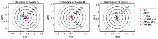 As shown in Figure 14, among all methods, the sound source distributions of OMP and off-grid-GL1 clearly show apparent discrete character, while the RPCA-SBL and the VG-SBL method are the most consistent and concentrated with the actual position distribution.