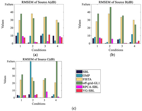 Next, the amplitude identification of the three sources is further analyzed. The four test conditions of 0 m/s@500 Hz, 0 m/s@300 Hz, 40 m/s@500 Hz, and 40 m/s@300 Hz are named Conditions 1, 2, 3, and 4, respectively. The amplitude errors of the three sources by different methods are depicted in histograms for comparison, as shown in Figure 15. When a source is not successfully identified, “Failure” is displayed.