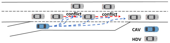 where and indicate the distance of CAV and MDV to the end of the acceleration lane, respectively; and are speed functions of CAV and MDV, which are decided by strategy ; is the current decision time; and is the estimated lane-changing time interval.