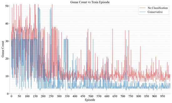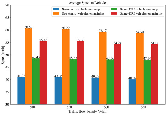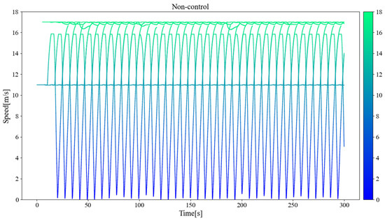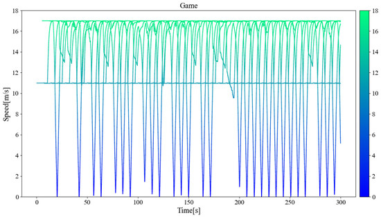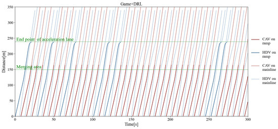 Figure 11, Figure 12, and Figure 13 separately show the displacement–time curves of vehicles with no control, pure game control, and reinforcement learning game control. This set of figures clearly shows the location of the merging vehicles completing their merges. In the figures, the red curve represents CAVs, the blue represents MDVs, the dark curve represents vehicles on ramps and acceleration lanes, and the light curve represents vehicles on the main road. The slope of the curve represents the speed of the vehicle, and the transition point from dark to light on the curve represents the location and timing of the vehicle merging into the main road. By comparing these three figures, it can be clearly seen that under the control of the proposed method, the position of the on-ramp CAV merging into the main road is farther away from the end of the acceleration lane and with higher speed. Figure 14, Figure 15, and Figure 16 show the speed–time curves of the vehicle, respectively. Comparing Figure 15 and Figure 16, speed fluctuation under the control of DRL and the game is significantly less than that under the game only. Because of integrating DRL into the game, the success rate and security have been further improved, and the fluctuation of speed has also been alleviated. These results demonstrate that the uncontrolled case presents a challenging scenario for merging due to the high density of traffic flow on the main road and that it fails to consider the potential for MDVs to engage in cooperative actions. In the case of pure game control, the results are similar to the simulation of the micro case study. The game model is unable to identify a strategy that can reach equilibrium quickly, and it is difficult to coordinate the actions of conflicting vehicle pairs in most cases. The speed also shows more dramatic fluctuations in the car. The reinforcement learning game serves to regulate the actions of merging CAVs, which are able to respond to the varying styles of MDVs that effectively predict their degree of coordination. In the case of conservative and moderate games, the realization of coordination is largely achieved. In the case of aggressive games, due to the high proportion of MDVs refusing to yield, it is difficult for merging vehicles to be inserted in front. Such a scenario is not implausible.