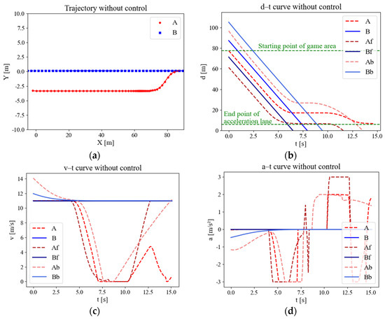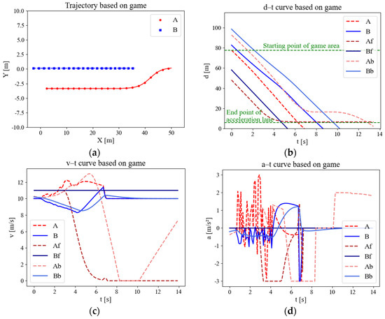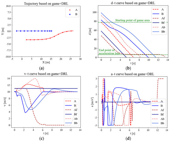 The variation in the parameters of the merging scenario based on the game model is shown in Figure 9. The lack of effective guidance regarding the driving strategy between each round of the game, in the absence of external control, resulted in a stalemate situation and sharp speed fluctuations in Figure 9c,d, which led to a lack of comfort and a low level of performance. Eventually, when it threatens the safety of vehicles on the main road, it forces them to slow down significantly, while merging vehicles accelerate sharply to achieve merging. Nevertheless, the pure gaming approach barely achieves a state of coordination compared to the uncontrolled approach; it can be observed that the slope of the displacement curve of CAV A in Figure 9b is always large compared with Figure 8b. This approach avoids the stop-and-wait gap that typically occurs at the end of the acceleration lane, which improves the timeliness of the merging vehicles. However, this comes at a significant cost, not only in terms of the sacrifice of comfort but also in terms of the creation of potential safety hazards.