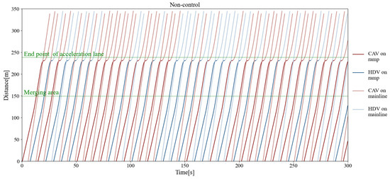 Figure 8 depicts the track, displacement, speed curve, and acceleration curve of the uncontrolled merging process. The merging of the CAV without control is represented by a model derived from SUMO’s LC2013. The results indicate that under high traffic densities on the main road, vehicles attempting to merge have difficulty in identifying an insertable gap that meets the safety constraints and consequently stop and wait in the acceleration lane, which can be seen in subgraph (c) speed curve, where the speed of the merging vehicle is equal to zero. Both dense points in Figure 8a and lines with small slopes in Figure 8b also indicate slow speeds.