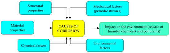 The corrosion of mining equipment frequently occurs due to the periodic mechanical demands to which their structural elements are exposed and the environmental conditions in which this equipment operates. The corrosion of mining equipment can occur as an effect of various causes, including structural properties, material properties, chemical factors, and environmental factors (Figure 1).