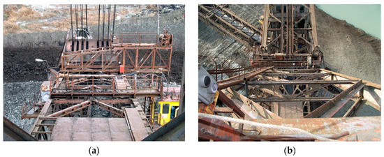 Figure 2. General corrosion—γ-Fe3O4 (brown rust): (a) wheel arm with type ERC1400-30/7 excavator buckets; (b) oscillating arm excavator tower ERC 1400-30/7. - Pitting corrosion (Figure 3) is a localised form of corrosion in which cavities or “holes” are produced in the material of the load-bearing structure when a liquid stagnates, flows slowly, or drips constantly and continuously on the metal surface. The central core of the cavity is considered to be more dangerous than uniform corrosion damage because it is more difficult to detect at depth [11,21,23,24,25]. Pitting corrosion is characterised by localised and deep changes in natural frequencies due to the formation of cavities. These changes are detectable through modifications in the energy distribution in the frequency spectrum;