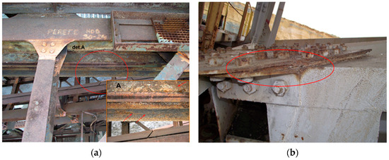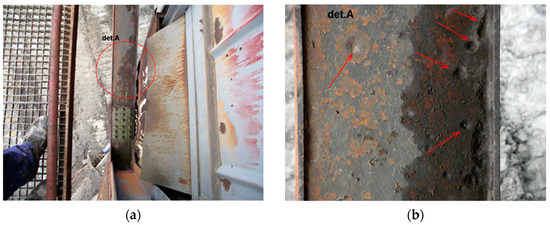 Figure 4. Exfoliation corrosion, γ-Fe3O4 (brown rust): (a) SRs 1300-26/3.5 excavator bucket wheel arm; (b) exfoliation corrosion details.