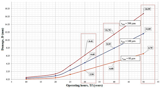 Based on Relations (8) and (9) and taking into account the corrosion class considered, according to ISO 9224:2012 [32], class C5I, with an annual corrosion rate of rcorr = 80–200 μm/year, a graph was drawn up for the amount of material loss from corrosion (Figure 5). The maximum period of 50 years was chosen according to the standard for mining machinery, DIN 22261/2 [33,34].