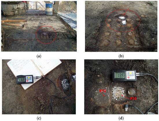 The impact of corrosion on the rotating platform of the ERC 1400-30/7 type machine after 40 years: (a) rotating platform of the ERC 1400-30/7 type machine affected by corrosion, the measuring area, the platform, and the stiffeners; (b) technological preparation of the measurement area; (c) ultrasound measurement of sheet metal thicknesses of 10 mm and 16 mm on the platform using a SAUTER TD225 type device, thicknesses marked with (#); (d) ultrasonic measurements—noting the measured thicknesses.