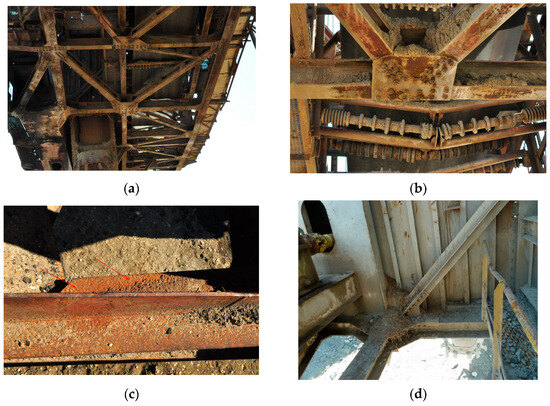 Material deposits on the ERC1400-30/7 excavator bucket wheel arm: (a) lower part of the bucket wheel arm; (b) belt conveyor detail on bucket wheel arm, bottom side; (c) corner corrosion detail, cup holder wheel arm metal construction; (d) cup wheel drive group holding beam.