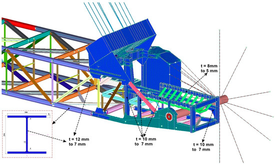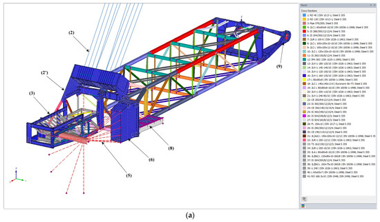 The substructure modelling of the bucket wheel arm is carried out using beam and plate finite elements, in accordance with the technical specifications established for this type of mining equipment. Beam elements can be standard, but can also include composite sections or welded sections as shown in Figure 10a. The discretisation of plate-type elements (2’), (6), (8), and (9) will be done with second-order plate elements, especially in the joint area (9), where the structure presents curved elements as illustrated in Figure 10a,b. The transition from beam to plate elements and the connection between the support and the shaft reducer are realised with rigid link-type elements, as shown in Figure 10b, position (5) [33]. An implicit solver was used for both static and dynamic analysis, suitable for both linear and nonlinear problems. The implicit solver provides good accuracy and is an efficient tool for analysing natural frequencies and vibration modes.
